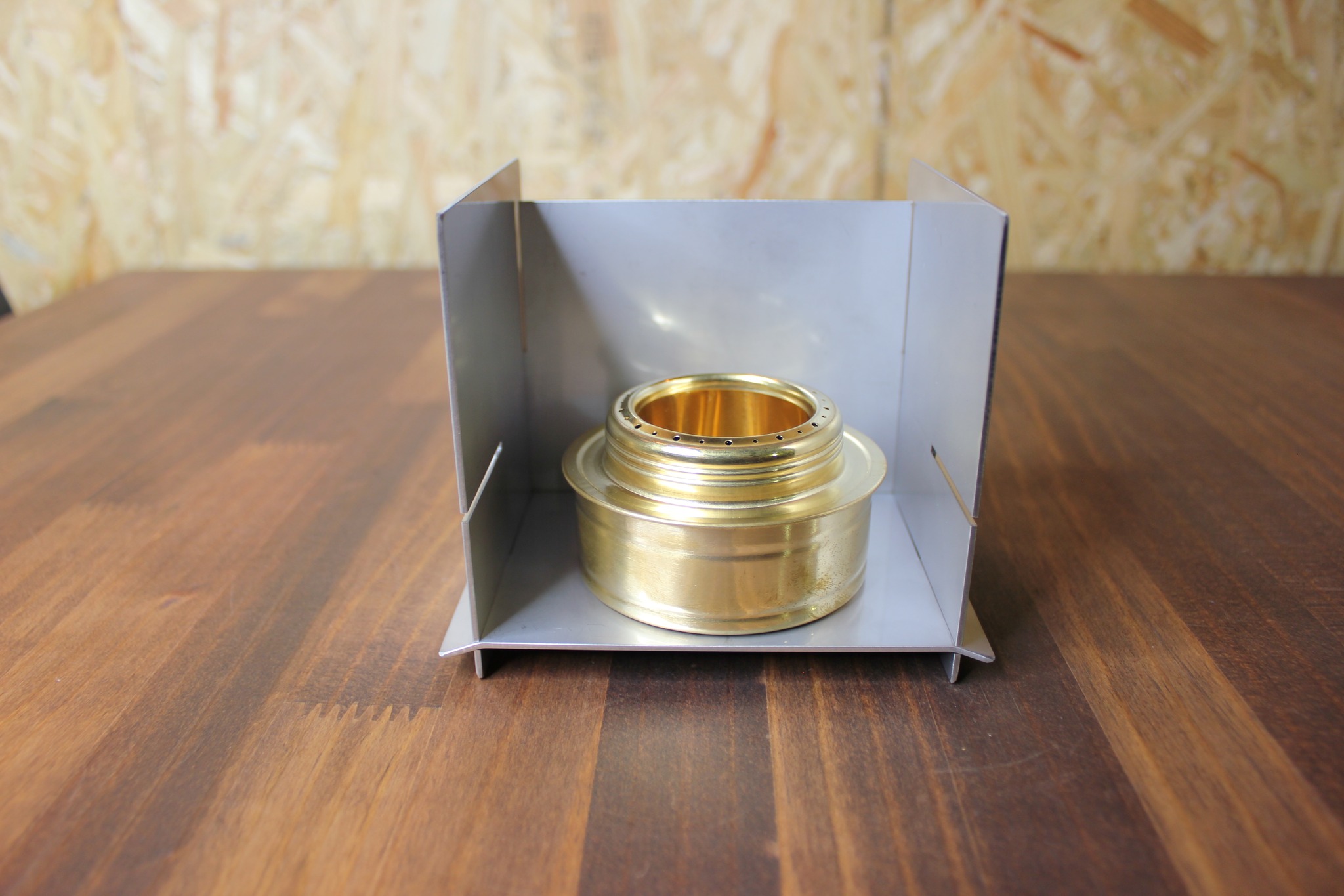 この五徳は側面板に切り込みを2カ所入れたので高さ調整が可能になっています。固形燃料とアルコールストーブのそれぞれの高さにイイ感じに仕上げました。欲を言い出すと色々と有りますが、分解時は薄くなるのでラージメスティンの中にスタッキング可能だし、エスビットの厚さの3分の一ぐらいになるから何かと便利かと思います。