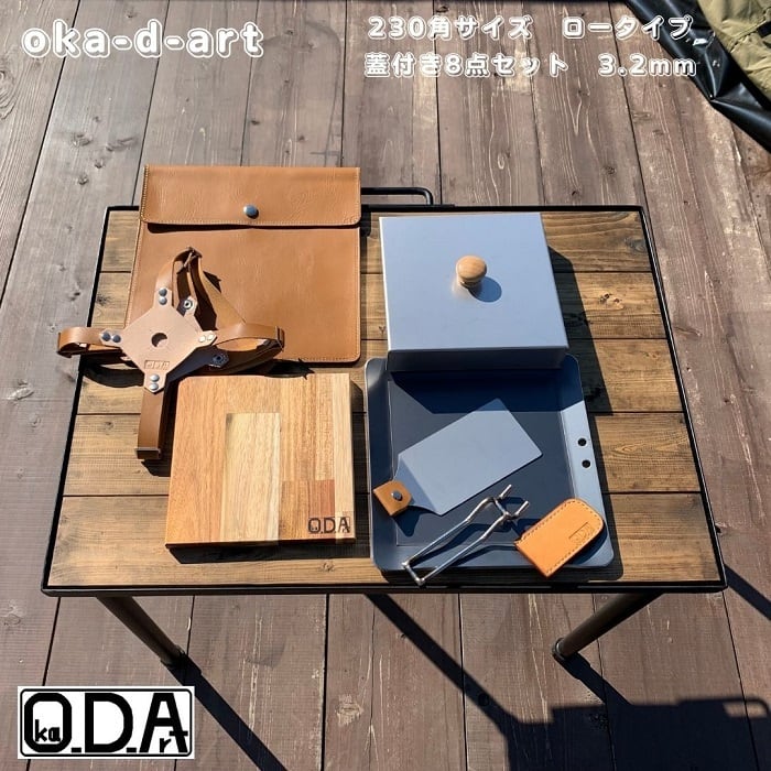 oka-d-art KA13-2SL 黒皮鉄板 鉄板 本革鉄板ケース ソロキャンプ鉄板 アウトドア鉄板 ソロ鉄板 BBQ鉄板 グリル ヌメ革製 キャメル8点セット品 230角・蓋高さノーマルタイプ40mm用 鉄板サイズ厚さ3.2mm×230mm×230mm 送料無料