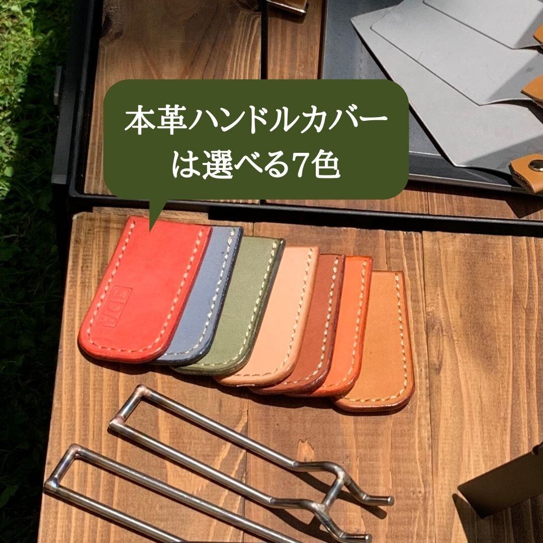 革製のハンドルカバーは全7色御用意しておりますのでお好みの色をお選びください。また革製ハンドルカバーには当社ブランド名「oka-d-art」のロゴが片面に刻印されています。