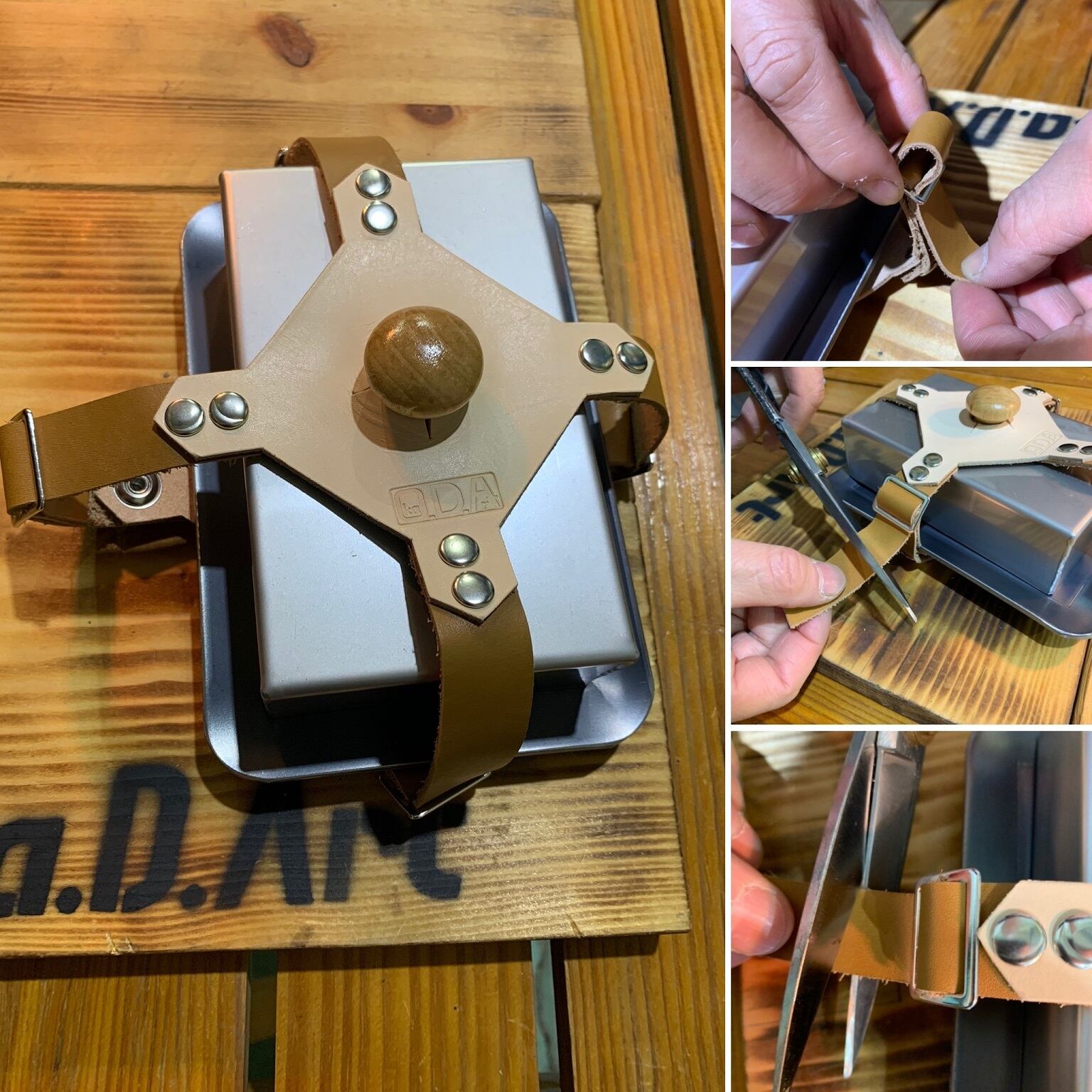 当社 oka-d-art製 230角用(鉄板サイズ230mm×230mm・本革鉄板ケースKA13用) の本革鉄板ケースとステンレス製の蓋(ハイタイプ高さ80mm)を固定する本革製のサスペンダーのセット品です。