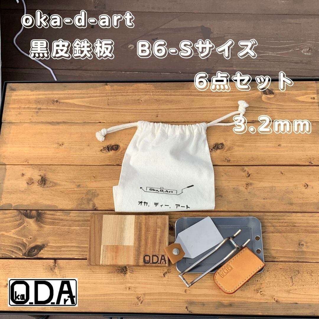 oka-d-art 357 黒皮鉄板 鉄板 アウトドア鉄板 ソロ鉄板 BBQ鉄板 B6-Sタイプ用 厚さ3.2mm×150mm×100mm コットン袋+本革ハンドルカバー付き6点セット 穴有り 送料無料